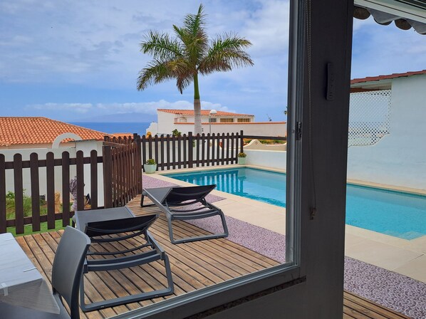 You will have 2 terraces facing South-SouthWest: the upper housing level terrace with swimming pool and covered outdoor lounge (pool house), the lower garden level terrace guaranteeing total privacy. Very sheltered from the winds, the sun will warm you from morning until sunset with a beautiful south-west sea view of the 3 islands (El Hierro, La Gomera, La Palma) and magnificent sunsets. You will appreciate the beautiful swimming pool with lighthouse (depth of 120 to 140) on one level on the upper terrace, 1 meter from the outdoor living room as well as the landscaped garden. 2 electric awnings guarantee shade as needed in the relaxation and dining area.