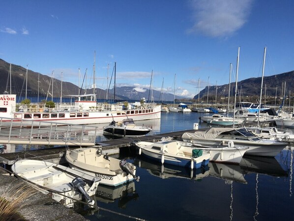 Loue confortable et très lumineux T2 meublé 3 étoiles en attique avec très grand garage fermé en S/S avec ouverture télécommandée dans immeuble récent de standing situé au 4ème et dernier étage avec ascenseur dans le quartier résidentiel du Grand Port à côté d'un Spa. Plage de Mémard à 300m, Golf à 5km et Station de ski à 20km. Commerces, restaurants et arrêts de bus à proximité. Très grande terrasse de 57m2 équipée de 2 Stores bannes électriques avec magnifique vue sur le Lac du Bourget, l'Abbaye de Hautecombe et les montagnes environnantes. Une table de jardin avec 6 chaises, un salon de jardin et 2 transats Hespéride sont à votre disposition pour profiter du paysage et du soleil. Pièce de vie lumineuse coin salon avec canapé Clic-clac et TV HD 43", coin repas et cuisine toute équipée (Plaque 3 feux à induction, Four, Réfrigérateur/Congélateur, Micro-ondes, Lave-vaisselle et Lave-linge). SDB avec douche très spacieuse, radiateur sèche-serviette et WC. Chambre avec literie neuve de 160x200, matelas 31cm avec mémoire de forme, chevets et 2 grands placards. Climatisation réversible, Stores électriques et chauffage au sol. Connexion gratuite à la Fibre WIFI Haut débit.