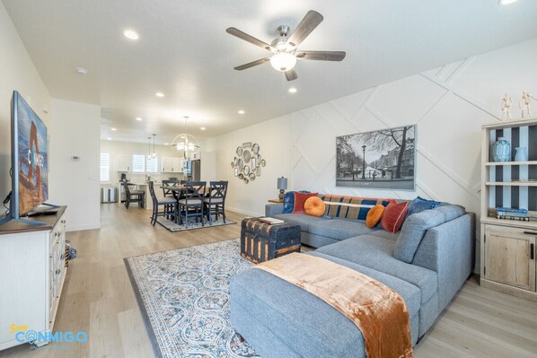 Welcome to our modern haven – an open concept space where the kitchen seamlessly blends into the living area. Enjoy culinary delights in our fully equipped kitchen, featuring a spacious pantry. The dining room beckons with a stylish table, while the inviting sectional and television create a cozy living space. Experience the perfect harmony of functionality and comfort in this thoughtfully designed home.