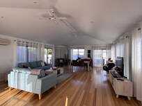 The house was spotless and very thoughtfully fitted out. The kitchen was generously stocked with all the little things that help with cooking - an abundance of spices, quality utensils even an air fryer! And a welcome bottle of wine. Plenty of fresh towels and rain shower heads in the bathrooms and much much more. The upstairs living area and deck are huge. It is a great place to relax and we would highly recommend it.