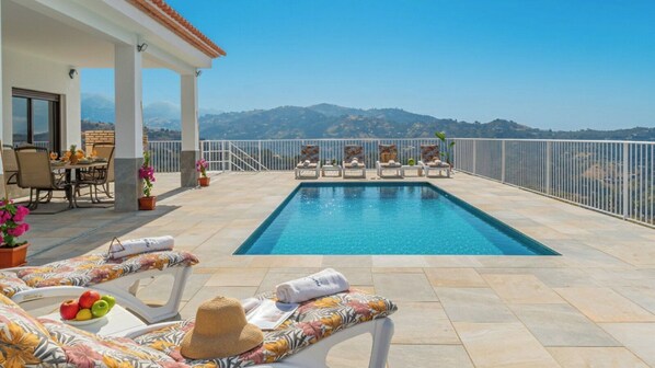 The porch has a dining table and comfortable chairs, perfect for dining al fresco while enjoying the views. The terraces include sun loungers to enjoy the Andalusian sun. The pool area invites relaxation and refreshment on warm days, and is complemented by a barbecue area for everyone's enjoyment.