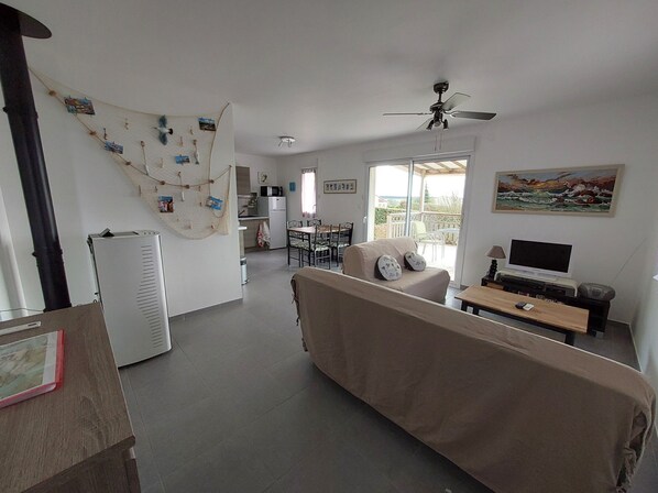 - 1 living room with a sofa bed, a sofa for 2 persons, television, radio, pellet stove,