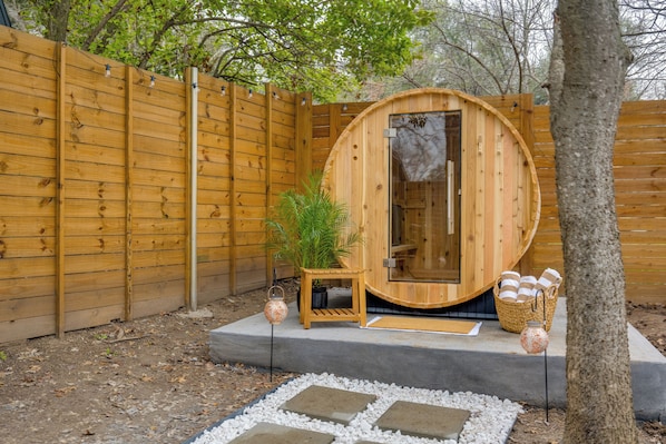 -Outdoor Sauna : Unwind in the private sauna after a day of exploring Austin or simply soaking in the sun.