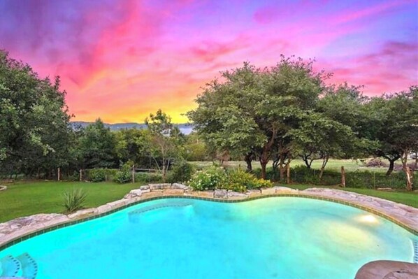 Unwind, explore, and soak in the beauty of Lake Travis from your own private oasis. Nestled on 1.4 acres in the Texas Hill Country, this stunning 4-bedroom, 3-bath retreat is designed for unforgettable getaways. Whether you're lounging by the private pool, stargazing from the hot tub, or grilling on the Traeger Grill stocked with pellets, this home has everything you need for relaxation and adventure.