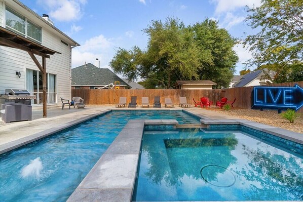 The primary suite has a private and large ensuite bath with a large walk in shower. The room itself offers a lush, king sized mattress with huge windows to watch a Texas sunset. The other bedrooms all have resort style, queen or double beds. There is a large, fully equipped chefs kitchen adjoined to the open living space next to the incredible outdoor area. The backyard offers plenty of seating with a massive pool/hot tub area, grill and covered patio.