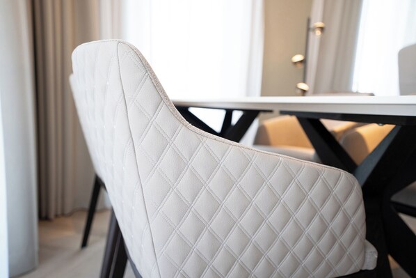 The apartment offers two cozy bedrooms with double beds and flat-screen TVs. The heart of the apartment is the modern living and dining area – with an open kitchen, spacious dining table, and a cozy fireplace that creates a special feel-good atmosphere. An elegant bathroom with bathtub and shower completes the comfort.