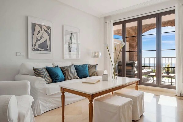 Nestled in the exclusive Los Balcones community within Los Arqueros Golf and Country Club, this bright and elegant 3-bedroom apartment is perfect for golf enthusiasts and vacationers alike. Offering stunning south-facing sea views, the spacious terrace invites relaxation with its chill-out area and outdoor dining table.