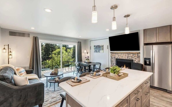 The living room has a queen sized murphy bed, a queen sized pullout couch, a 55" smart TV with streaming apps built in, and a fireplace for those colder evenings. Connected to the living room is the beautifully stocked kitchen which features all of the modern appliances; fridge/freezer combo, a four burner range oven, microwave, coffee pot and a dishwasher! No need to bring any dishes or cookware because we've made sure to equip the kitchen with everything you might need to cook all of your favorite recipes!