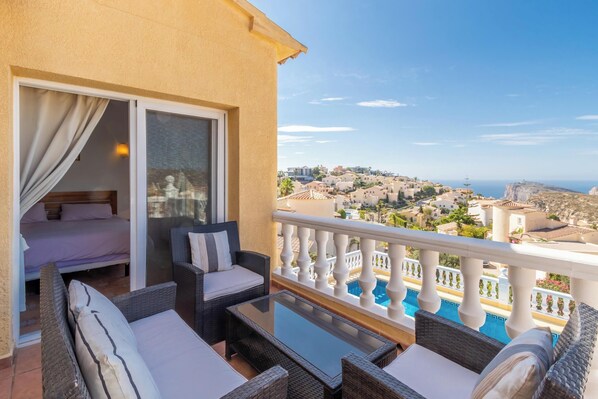The outdoor area is complete with a large private pool (pool heating is available from March until October), sun loungers and an outdoor shower. Spend the day relaxing outside and enjoy the impressive mountain and sea views to be seen from the terrace. There is a covered dining area next to the kitchen with a BBQ where you can enjoy home-cooked meals and watch the sun disappear behind the mountains. There are also ample shaded areas for children to play in.