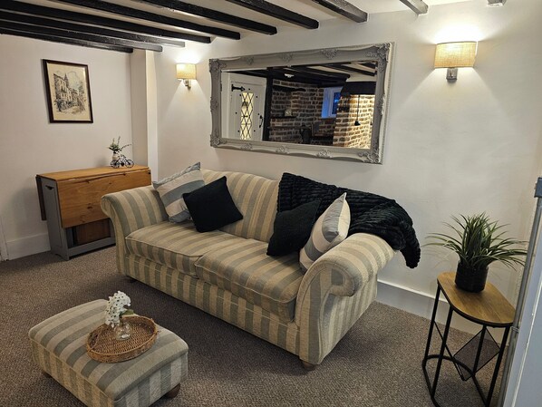 A warm and inviting space featuring original beams, a crackling log burner, and thoughtfully preserved period details. The cottage has been recently updated to a fresh, modern standard, blending its historic charm with all the comforts you will need.