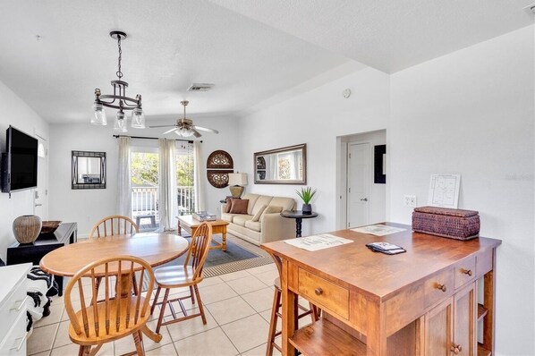 Inside, the home features an open floor plan with a warm, welcoming ambiance. The cozy seating area invites relaxing conversations or movie nights after a day in the sun. The fully equipped kitchen boasts stainless steel appliances, ample countertops, and island seating, making meal prep and casual dining a breeze. The dining table comfortably seats four, perfect for family dinners or friendly gatherings.