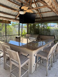 Had the good fortune to stay here for 2 weeks. The property is just as described and photographed. Took advantage of the pool every day. Most of us are in the 65 to 70+ age range and if we could add anything it would be a handrail for pool entry. The outdoor kitchen and Tiki bar was over the top. Hope to stay again in the future.