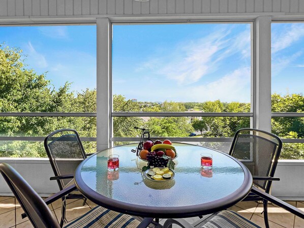 🌲 Private screened-in balcony with outdoor dining space