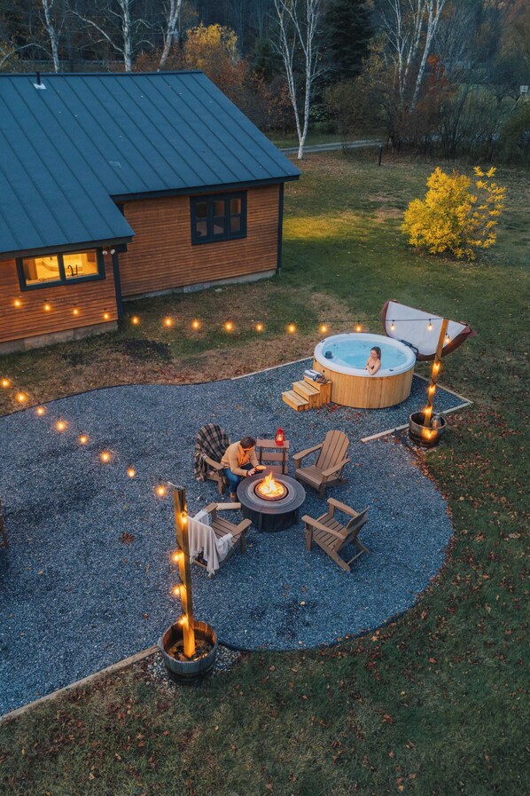 • A large outdoor area with a private Nordic Cedar Hot Tub, a Solo Stove smokeless wood-burning firepit, a Fuego gas grill, and dining area. Propane for the gas grill and firewood for the fire pit are provided.