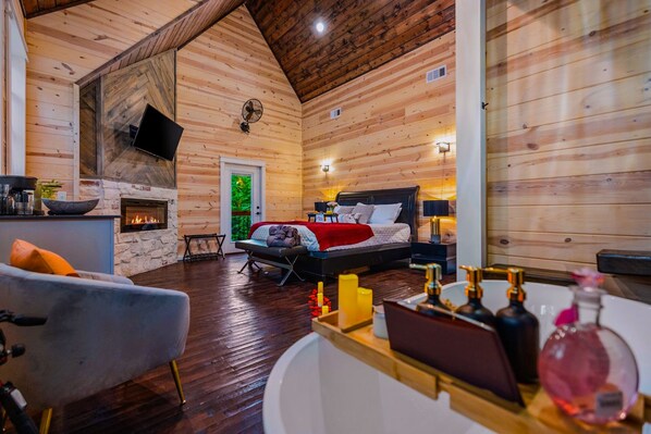 Master Suite (Upstairs): King bed, ensuite bathroom, Smart TV, electric fireplace, and floor-to-ceiling windows with serene forest views. The spa bathroom features a chandelier above the soaking tub, a rainfall walk-in shower, dual vanities, and luxury toiletries.