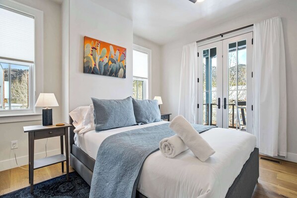 Bedroom 3 (Second Floor): Queen bed with balcony access and mountain views