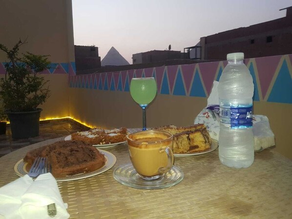 flat with a roof top, open view at the pyramids