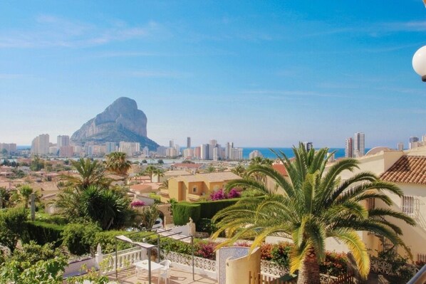 This comfortable, spacious villa is situated in the quiet residential area of Enchinent, just 1,5 km from the beach and many shops, bars, and restaurants of the lively resort of Calpe. A very peaceful location with easy access to all amenities. There is a panoramic view of Calpe, the sea, and the famous Peñon de Ifach from Juanjos´s balcony, whilst the villa is set in an extensive terraced garden bordered by trees and shrubs, with a kidney-shaped swimming pool, BBQ, and shaded outside dining area.