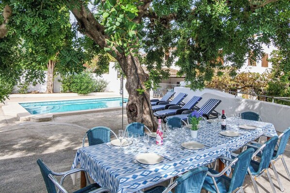 Located in Campanet, in the northeast of Mallorca, and boasting beautiful views, the 300 m² vacation home consists of a living room, a well-equipped kitchen with a dishwasher, 5 bedrooms as well as 3 bathrooms and can therefore accommodate 10 people. The home includes Wi-Fi (suitable for video calls), satellite TV, a washing machine, air conditioning and central heating. This child-friendly home also offers a highchair on request for free. There is a balcony, and you can also spend your afternoons by the private and fenced pool area, which is also equipped with a shower. Enjoy the sea and mountain views in your private outdoor area which has a furnished garden with both covered and open terraces, where you can spend the evenings with tasty dinners from the stone barbecue. In approximately 14 minutes on foot, you will reach the centre of Campanet, with several supermarkets, restaurants and cafés. A 20-minute drive from the vacation home, Port d'Alcúdia invites you to relax on its sandy beaches and discover the promenades and the marina. Palma de Mallorca is a 30-minute drive (37 km) from the property, and the airport is a 35-minute drive (46 km) away.