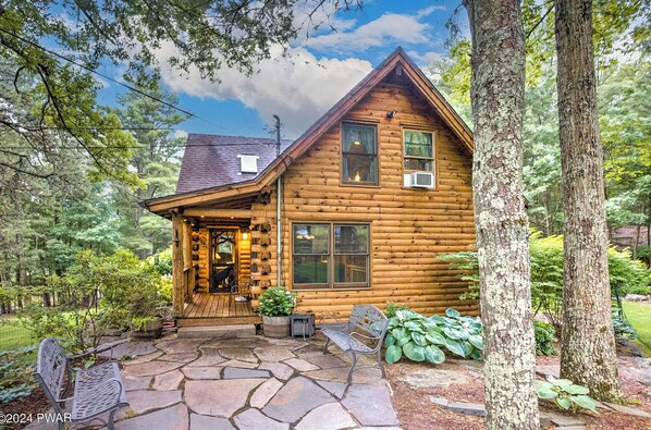 A true log cabin with 3 bedrooms, 2 full bathrooms and 2 half baths, nestled in a serene forest setting, surrounded by towering trees and the natural beauty of the Pocono Mountains, within close proximity to Skytop Lodge.