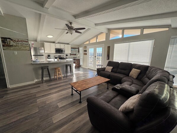 Canyon Lake is waiting for you at this 2-bedroom house. This awesome property features 1 queen bed in the first room, and the second room has twin bunk beds, and 2 single twin beds, perfect for a fun getaway. With WiFi, a washer/dryer, heating, and AC, guests will have everything they need. The bathroom offers a refreshing shower to start or end your day. Full kitchen with all basic needs for whipping breakfast, lunch, and dinner after a fun day on the lake or river.A great place to call homebase and enjoy views of the hills from the balcony or sit under the stars at the fire pit.