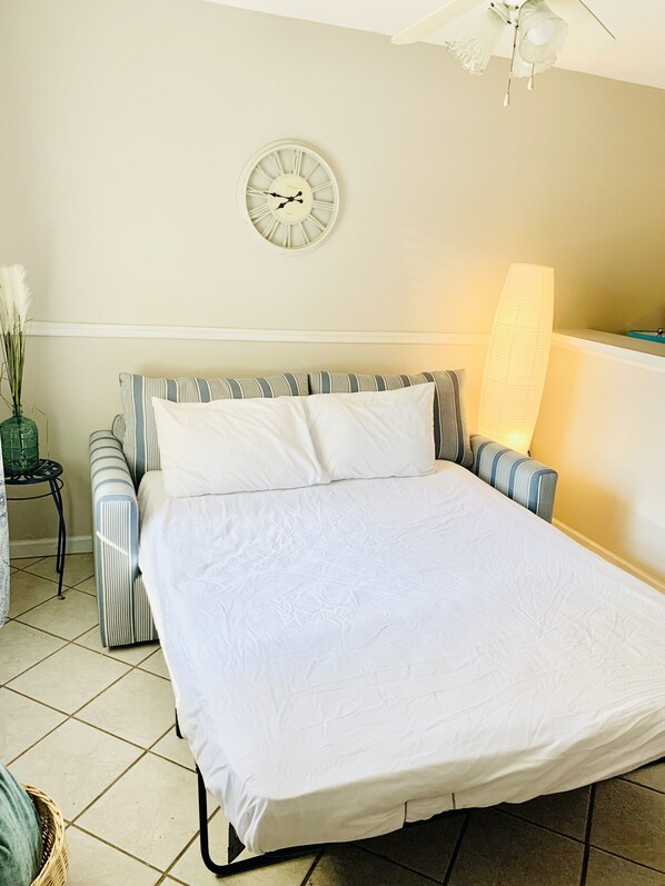 Very, very, small with dirty floors and throw rugs. So much light on the buildings and street, only light blocking curtain on the front. No door to close between the kitchen and bed in the back, so it was like sleeping under a spotlight. I bought light blocking material to put on the kitchen window. We had to ask for bath towels & a kitchen towel was brought, looked like it was used to wash a car. We stayed for 16 days, and when our trash was full, so was the dumpster, when I asked where the replacement trash bags were, at first was told they weren't included, then she ordered them and they were delivered two days later. We used our laundry bag for the trash. This tiny room is in a residential building, not a great neighborhood. Good neighbors, kind of junky apartments for blocks around. The beach is several blocks away. The best thing about the place was the water pressure and the instant hot water in the shower. We would not recommend this rental. It's cheap for a reason.