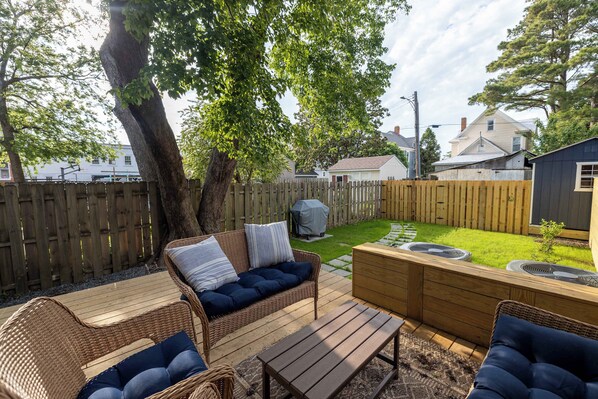 Step outside to enjoy peaceful mornings or relaxing evenings on the classic front porch, which features two Adirondack chairs—the perfect spot to sip coffee, unwind, and watch the neighborhood go by. Gather with loved ones on the back deck for a barbecue, complete with a propane grill and comfortable seating. The backyard is fully fenced, providing privacy and a safe space for your furry companions to play. A stone walking path leads from the private parking space accessed by the back alley up to the deck, so you can easily come and go without walking on the grass. Additional parking is available on the street in front of the house.