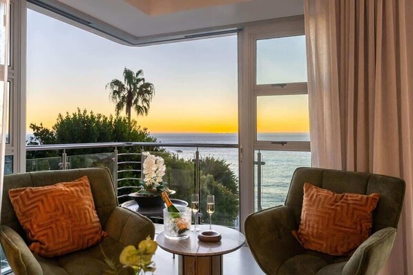 Just below Unit 1, this unit offers a similarly luxurious experience in a 3-bedroom, 3.5-bathroom setup. This apartment features a serene patio, ocean views, and an elegant open-plan living space. The spacious lounge includes a large-screen TV and opens to a modern kitchen with premium appliances and a separate scullery. An indoor patio space with sliding doors brings the outdoors in, offering yet another vantage point to soak in the views.