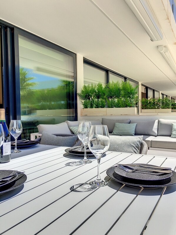 This modern style ground floor apartment is designed with open spaces and large windows looking out to the pool and garden area. The apartment has 2 bedrooms, 2 bathrooms, open plan kitchen and lounge area with breakfast bar and stools. The large terrace leads out from the lounge and kitchen and overlooks the pool and gardens. The master bedroom has an en suite shower bathroom and the built in dressing room which is located next to the bed area. There is a second bathroom also with a shower that services the second bedroom.