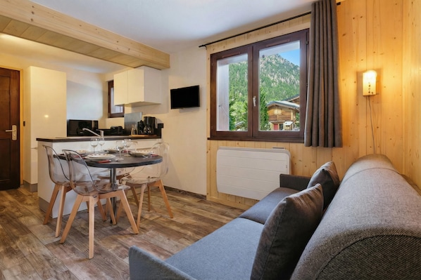 L\'appartement peut accueillir 4 personnes et est décoré dans un style contemporain avec quelques touches alpines. La salle de séjour est lumineuse et aérée, avec des planchers en bois partout. Il y a un canapé et une télévision à écran plat, ainsi qu\'une table à manger rabattable et d\'élégantes chaises en plexiglas. Le balcon en bois, où vous pouvez vous asseoir et profiter de la vue sur les montagnes, se trouve à côté de la salle de séjour. La cuisine ouverte est équipée d\'une plaque de cuisson, d\'un micro-ondes, d\'un réfrigérateur/congélateur et d\'une cafetière.