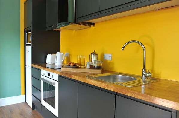 Our Holst inspired apartment is a one bedroom complex with en-suite bathroom, fully-fitted kitchen and a relaxing living area. Located on the first floor and accessed by a wide Victorian staircase, the Holst apartment features high ceilings, original sash windows and plenty of character. It's been refurbished to an exemplary standard.