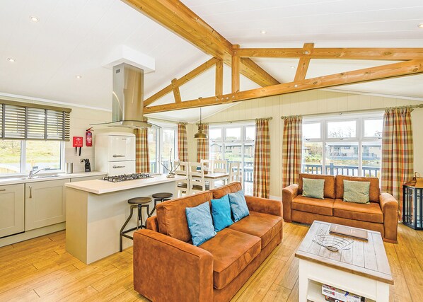 Escape to indulgence with our luxurious lodge, an ideal haven for a relaxing break with friends or family. The open-plan living space welcomes you with large windows, allowing natural light to flood in, complemented by comfy sofas and a warming wood burner for added cosiness. Enjoy entertainment on the Flatscreen TV, and savour culinary moments in the stylish kitchen with a breakfast bar and an elegant family dining area. The two spacious double bedrooms feature contemporary en suite bathrooms, ensuring a touch of luxury. Additionally, a well-sized twin room and a family bathroom with a bath and overhead shower complete the accommodations. The enchanting French doors lead to the outdoor decking area, an idyllic space for soaking up the sun in the warmer months. Please note: If you plan to bring a cherished pet, use the pet filter during the booking process to inform the resort in advance. Immerse yourself in luxury, create cherished memories, and let this lodge be the perfect backdrop for your rejuvenating escape. Pets allowed in selected accommodations only.