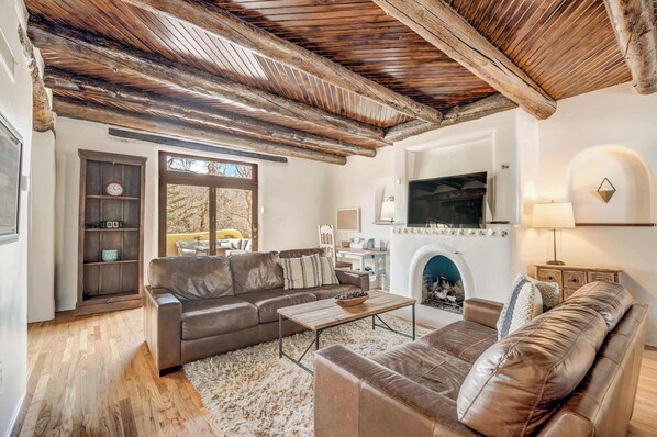 Spread out and settle in across beautifully designed gathering spaces featuring adobe-style fireplaces, beamed ceilings, and eclectic charm. The main living room offers a Smart TV, board games, and plenty of comfortable seating for movie nights or lazy afternoons. Additional sitting areas throughout the home provide quiet nooks for reading or reconnecting.