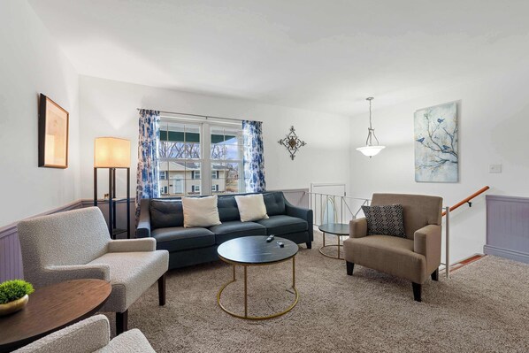 Downstairs, the basement living area offers even more comfort and convenience. This additional space features a kitchenette, table for four, and a spacious sectional with a smart TV, creating a cozy retreat for movie nights or extra privacy for guests. With thoughtful amenities, ample entertainment options, and a prime location, The Gahanna Getaway is an excellent choice for your next Columbus getaway.