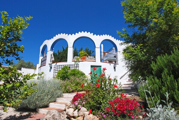 Tucked away in the rolling hills near the charming village of Comares, this villa offers peace and character in equal measure. Step through the gate and you’re welcomed by a colourful garden filled with palms, vibrant blooms, and hidden corners to relax in. Everything here invites you to slow down and soak up the atmosphere.