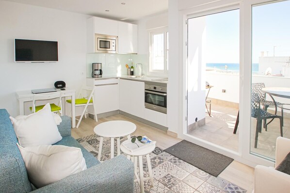 A large glass sliding door leads to the small terrace with table and chairs - from the entire 2nd floor and the terrace there is a magnificent sea and beach view. A shade-awning is available here.