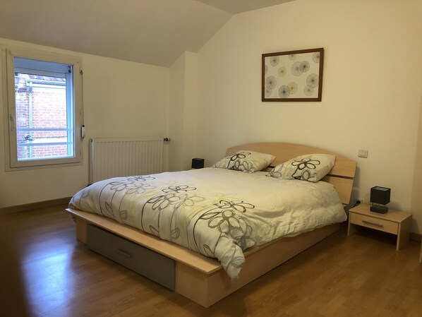 ▶ Premier étage : chambre est meublée d’un bureau avec fauteuil, d ’un lit 2 personnes (140*190), de 2 tables de chevet + lampes, d’une armoire, portant à vêtement sur roulette.