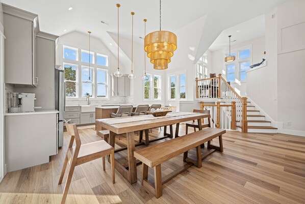 The open concept design allows for large family gatherings with a vaulted ceiling great room, flat-screen TV, and a large sectional sofa with 2 nearby armchairs. The Ships Watch has a small desk if a guest needs some space for computer work. The Dining table is for 8, kitchen island for 3, and a small table for 2 — totaling 13 seats. . Sliding doors bring guests outside to a furnished screened porch that has a couch and chairs for enjoying the outdoors, while being shaded from the summer sun. The modern kitchen has stainless steel appliances and a standalone beverage center for chilling drinks as well as freeing up space in the fridge for other groceries. A farmhouse sink is deep and handy for meal prep and fast clean-ups. A King Master Suite is on this level which also has deck access; its master bath has 2 sinks and a tiled shower. Stairs down to the mid level come to a landing where a half bath is located.