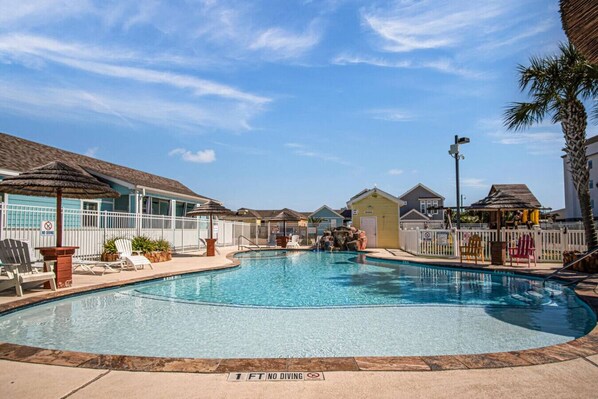 This charming Pirates Bay unit is just steps from the tropical community pool—you can even hear the soothing waterfall 💦. Outdoor living truly shines with a covered tiki-style cabana, inviting patio space, and an outdoor shower for rinsing off sandy toes.