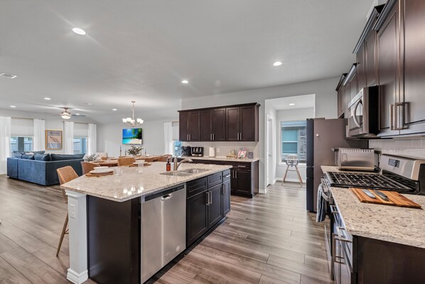 🍳 Fully Equipped Modern Kitchen Stainless-steel appliances, spacious island seating, and everything you need to cook, serve, and gather.