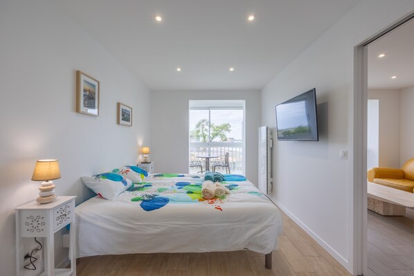 - Chambre 1 : un lit queen-size (160×200), armoire, une salle d'eau avec douche et WC, TV...