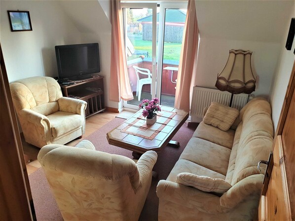 The apartment is located on the 1st floor with balcony, small hallway. The living room has an open kitchen and is equipped with various kitchen appliances. The living room has a couch, a flat-screen TV. The living room has rugs. Shower / wc. The bedroom is located on the courtyard side overlooking the stork's nest on the barn roof. It has a double bed.  An additional living space can be reached within this apartment (from the living room) via a staircase to the 2nd. Upstairs. This open plan bedroom has a size of 10 m² (two single beds). From here you have a better view of the stork's nest.