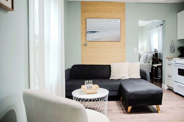 Step inside Petite Paradise and experience a warm, inviting space that maximizes every inch. The open layout includes a plush queen bed, cozy seating area, and a fully equipped kitchenette ideal for light cooking and dining. Large windows bathe the home in natural light, while modern finishes and smart storage keep the space feeling airy and serene. Enjoy fast Wi-Fi, a smart TV, and climate control for your comfort. Whether you’re curling up with a book, streaming shows, or soaking in the calm, Petite Paradise is your perfect spot to unwind and recharge.