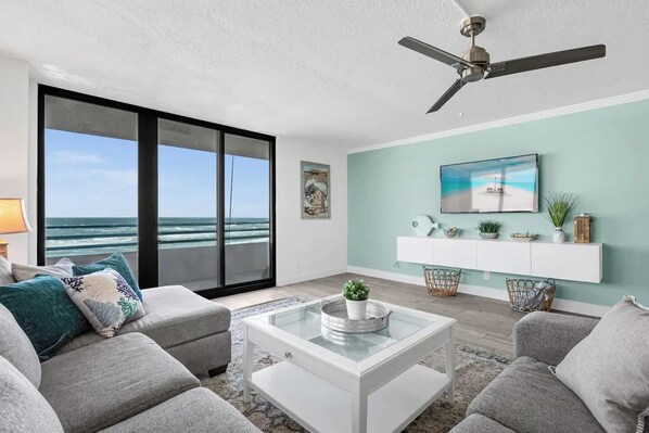 Escape to paradise in our beautifully remodeled oceanfront condo located right on Daytona Beach! With breathtaking, panoramic ocean views from the living room and private balcony, this vacation home offers everything you need for a perfect beach getaway. Whether you're lounging by the beach, swimming in the pool, or exploring Daytona’s local attractions, our condo is your ideal retreat.