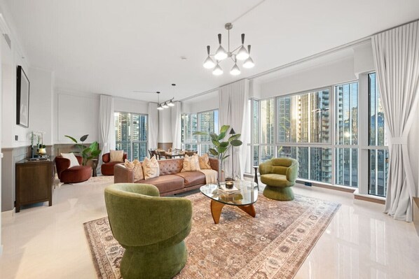 Elegant two-bedroom apartment in Downtown Dubai offers luxury and comfort. The master bedroom features a king-size bed, while the second bedroom has two queen-size beds, accommodating up to six guests. It includes two modern bathrooms with premium fixtures. The spacious living room, with plush seating and contemporary decor, showcases breathtaking views of the Burj Khalifa and Dancing Fountain. Perfectly located near top attractions, it’s the ideal base for a memorable Dubai experience.