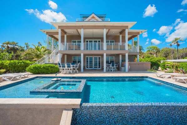 Spanning 6,500 sq. ft. across four floors, Our Cayman Cottage is the perfect family vacation home. Guests can take a dip in the oceanfront pool and spa, enjoy alfresco meals with a view on the balcony, or retreat to the lower-level game room for hours of fun.