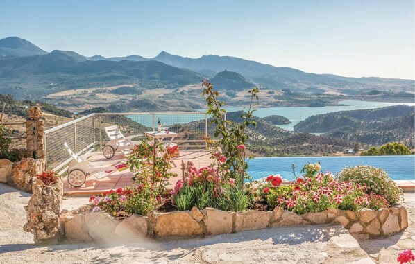 Only a few kilometers from El Gastor near Cadiz and 20 kilometers from Ronda you will find this fantastic vacation home in a dreamlike, picturesque landscape. The house combines rustic and modern architecture. As soon as you enter the beautiful outdoor area, the house welcomes you with its traditional facade, the pretty covered terrace and the gorgeous infinity pool, which gives you a breathtaking panoramic view of the surrounding area and the reservoir of Zahara. Enjoy the connection to pure nature here and let your soul dangle. On the various terraces you can benefit from the optimal climate of the region while sunbathing, barbecuing or reading a book. The 2000 m² property is completely fenced and thus offers plenty of run and exploration area for your pet.