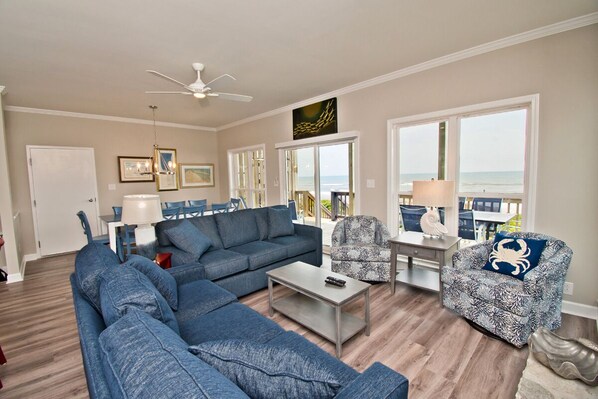 Level One: Living Area has direct access to the Ocean deck. Large dining area. Kitchen with microwave, dishwasher and bar seating. Bedroom #2 with Queen. Full Bath.