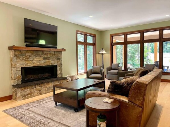 As you enter the home, you are greeted with beautiful modern wooden stairs headed up to the second floor, or to your left you will find the wonderful open concept gathering room open to the kitchen, dining room, and living room. The kitchen is a chef's dream with all you will need to gather and create scrumptious meals complete with a gas stove, bar seating, and dining for 8. The living area has a gas fireplace where you can warm up on those cool mountain evenings and play a game, read a book, or watch a dvd. The living room sitting area overlooks the backyard, outdoor covered porch with dining area, gas grill, Adirondack chairs around the fire pit and all placed perfectly to enjoy the fun of the trains coming and going through the mountain pass.