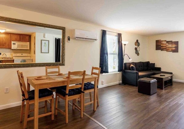 this cozy abode is super clean Brand new furniture welcome you with a Queen bed and full size sofa bed . linens are provided. New 40 inch smart TV will help you wind down. Did we mention FREE WIFI!?